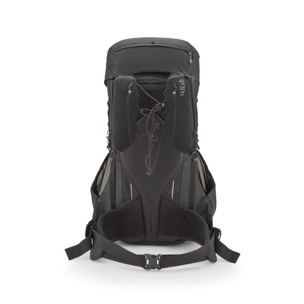 Batoh disponuje zajímavě řešenými ramenními popruhy trochu ve stylu běžecké vesty. Na obou popruzích jsou objemné síťované kapsy na zip, které bez problému pojmou i větší smartphone, tyčinky, případně další drobnější věci. Pro optimální stabilizaci batohu slouží dva navzájem propojené hrudní popruhy. U Rabu ani nezapomněli na často opomíjené stabilizační popruhy, díky kterým si můžeme náklad přitáhnout blíže k těžišti. Boční kapsy jsou u batohu až extrémně prostorné, takže pojmou i ty největší láhve na vodu. Navíc jsou velmi snadno přístupné. Tyto kapsy i částečně nahrazují kapsy na bederním pásu, které u tohoto batohu chybí. Z venku batohu je skvělá přední síťovaná kapsa, která velmi dobře poslouží pro uložení mikiny, bundy a podobných věcí, které chcete mít během dne stále při ruce. Po stranách a na dně batohu jsou další kompresní popruhy, které se dají využít pro připevnění dalšího vybavení jako třeba pěnové karimatky.