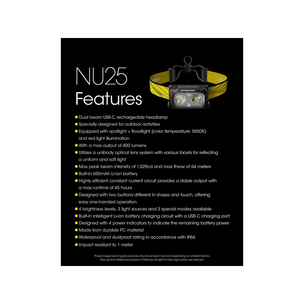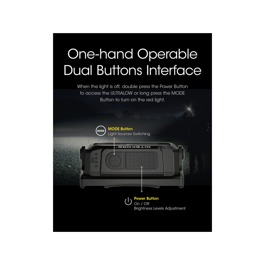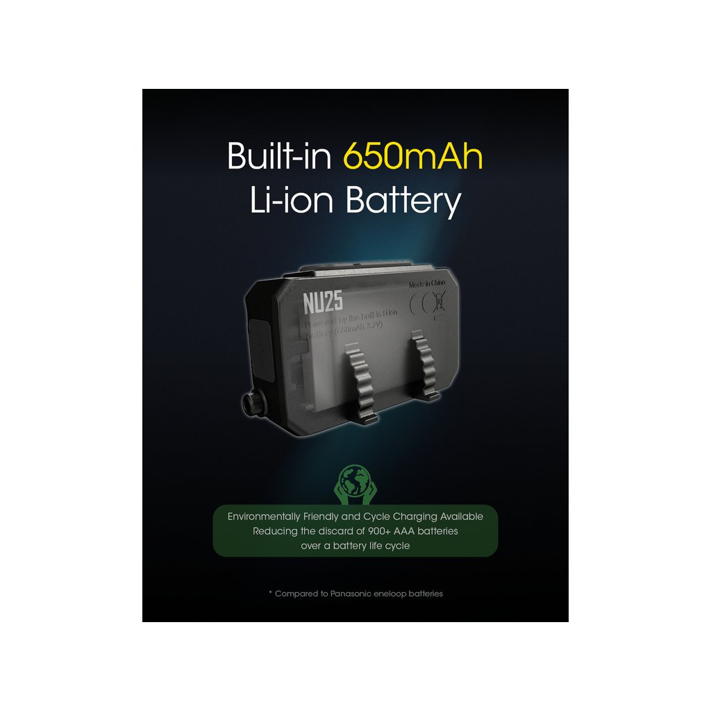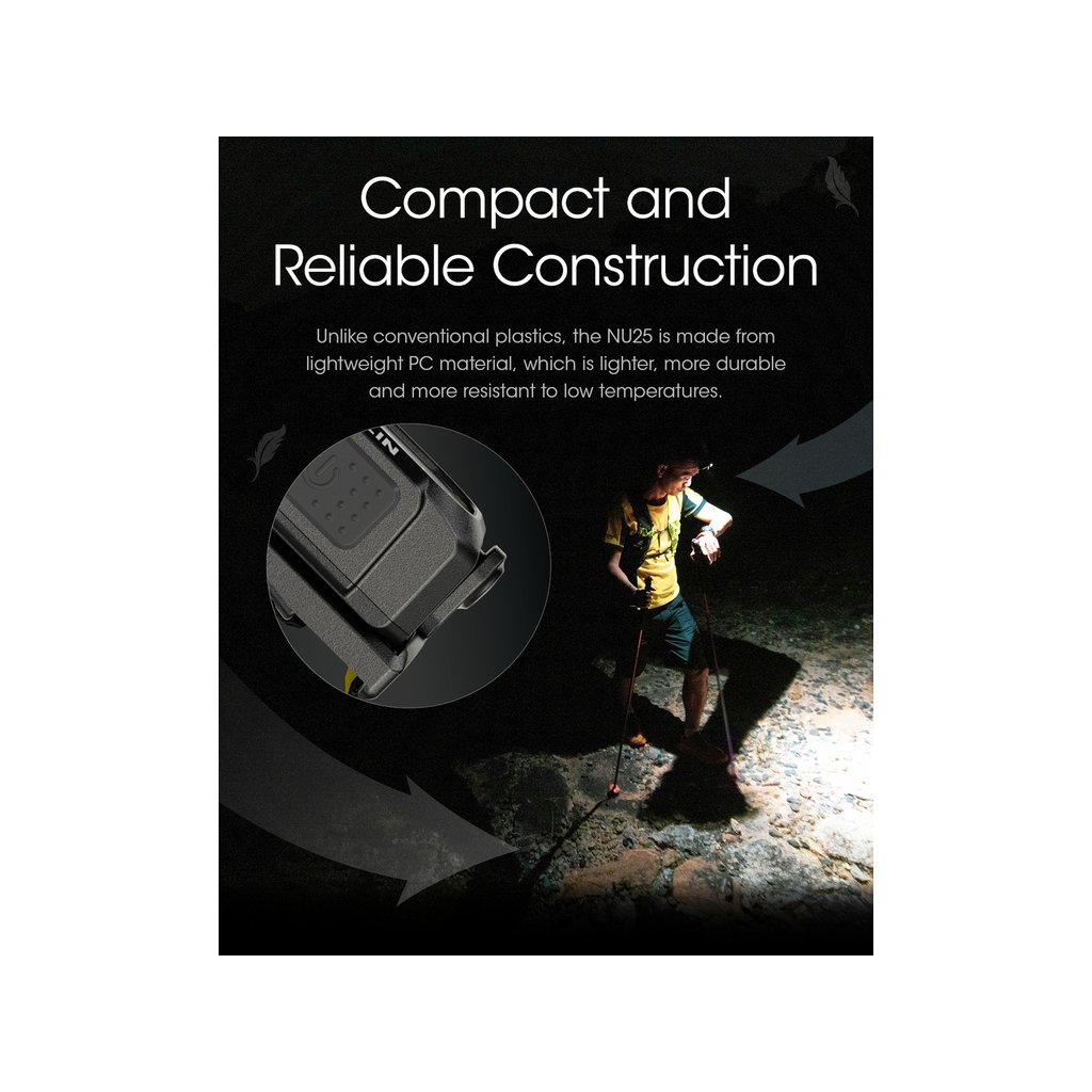 Nitecore NU25 V2 je ovládaná dvěma spínači. Při stisku obou tlačítek naráz dojde k uzamčení tlačítek čelové svítilny. To je vhodná doplňková funkce pro cestování s čelovkou v batohu. Nedojde tak k nechtěnému zapnutí a vysvícení čelovky. Jako další novinka u nové NU 25 V2 je i integrovaný indikátor stavu nabití akumulátoru.