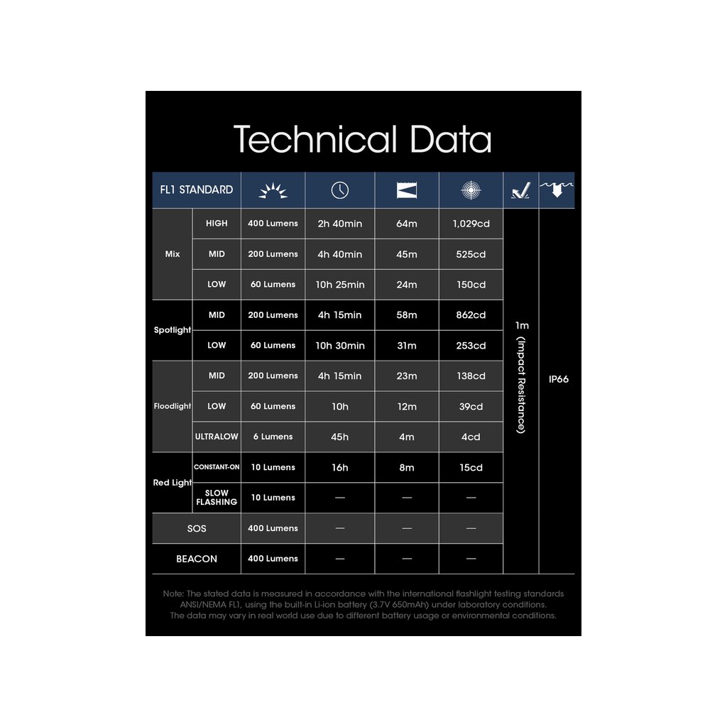 - Maximální výkon 400 lumenů s dosvitem až 64 metrů.