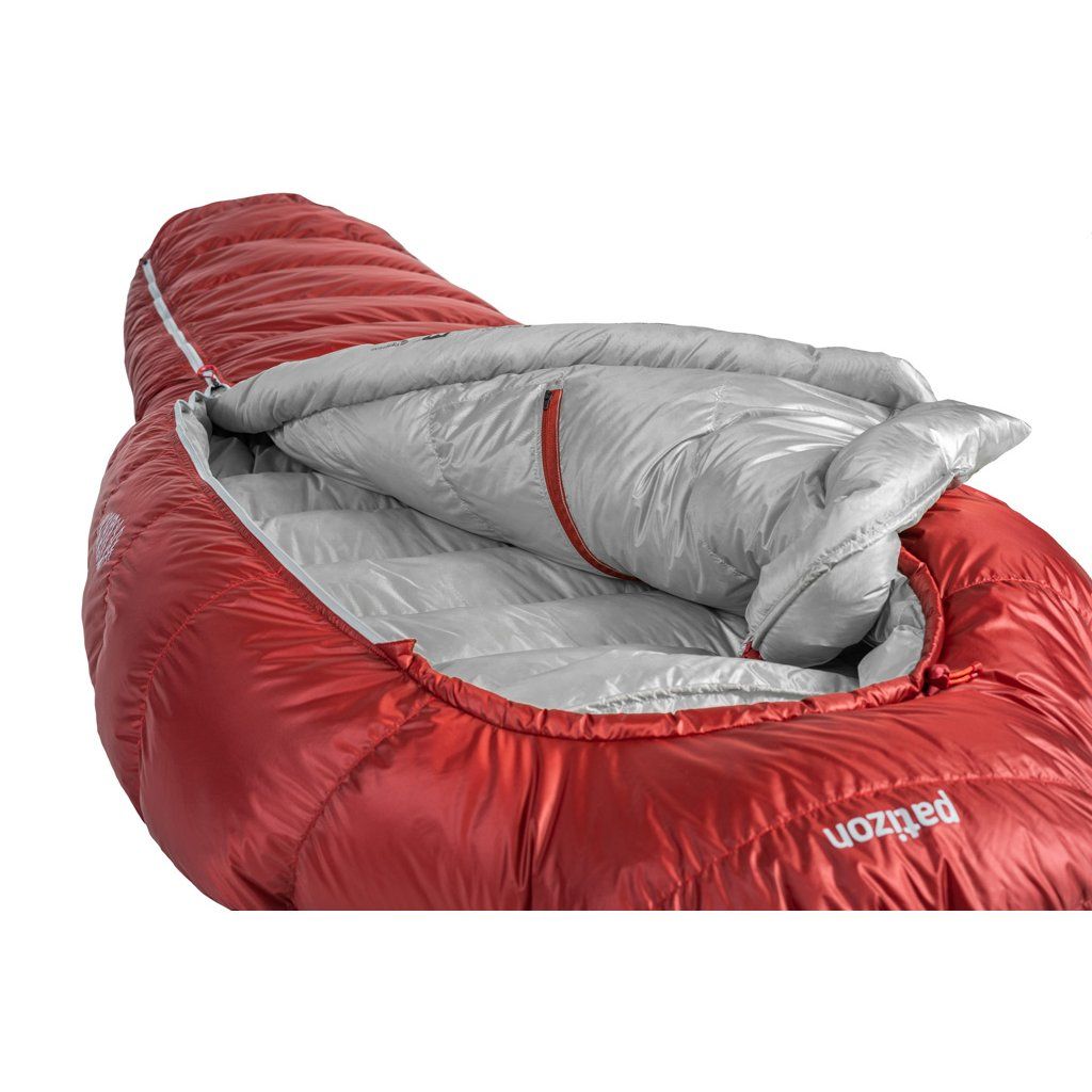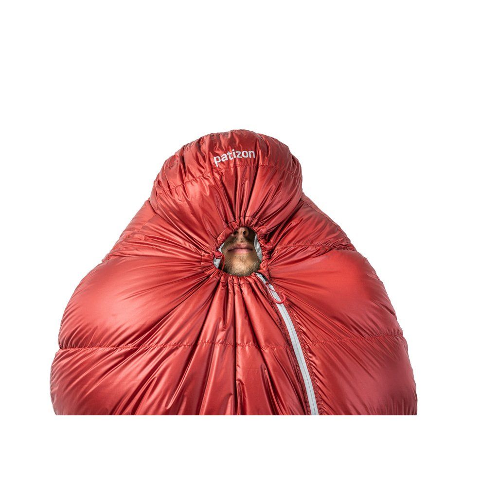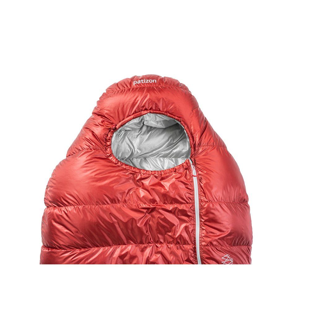 Konstrukce komor ve tvaru Z napomáhá rovnoměrnému rozložení náplně v komorách a zároveň zabraňuje vzniku chladných míst ve švech. Spacáky Patizon mají anatomický tvar, tak že kopírují tvar postavy aby docházelo k co nejefektivnějšímu udržení tepla. V ramenou jsou ovšem spacáky nadstandardně široké, takže se v nich dá pohodlně otočit. V nohách jsou komory upraveny tak, aby byla izolace co nejvyšší. Na kapuci si v Patizonu dali opět velmi záležet. Skvělý tvar, stahování jednou rukou a obvodová léga vyplněná syntetickou izolací Climashield kvůli náchylnosti na vlhký vzduch, který do kapuce vydechujeme. Celý hlavní zip je samozřejmě podložený izolační légou, aby se eliminoval únik tolik drahocenného tepla. Uvnitř spacáku nalezneme prostornou kapsičku na zip o rozměrech 20 x 20 cm, která bez problému pojme telefon, čelovku, baterie nebo jakékoliv drobnosti, které je nutné udržet v teple. Jako největší vychytávka spacáků Patizon je poloautomatický, dvoucestný YKK zip. Ten funguje ve dvou polohách – Stop and Go. V poloze Stop (taháček směrem dolů) je zip aretovaný v dané poloze a nerozepíná se, aniž by musel být pojištěný drukem nebo suchým zipem. V poloze Go (jezdec nahoru) lze zip rozevřít pouhým roztažením do stran. Rychlé a efektivní.