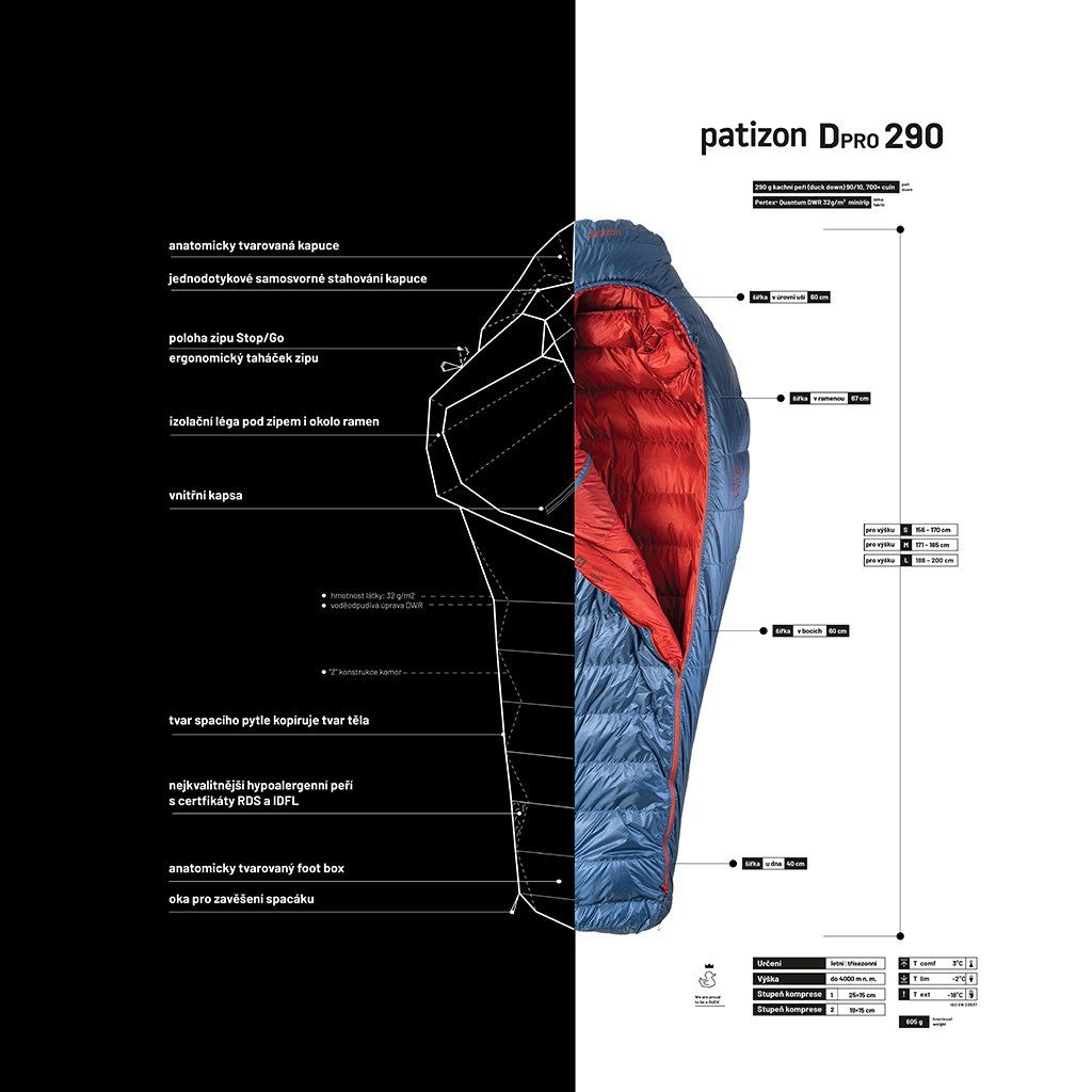 Zásadní je, že Patizon pro své spacáky používá jen ty nejlepší materiály. Řada spacáků Dpro series vyniká v podstatě ve všech ohledech - skvělý komfort, nízká hmotnost a výborná sbalitelnost.