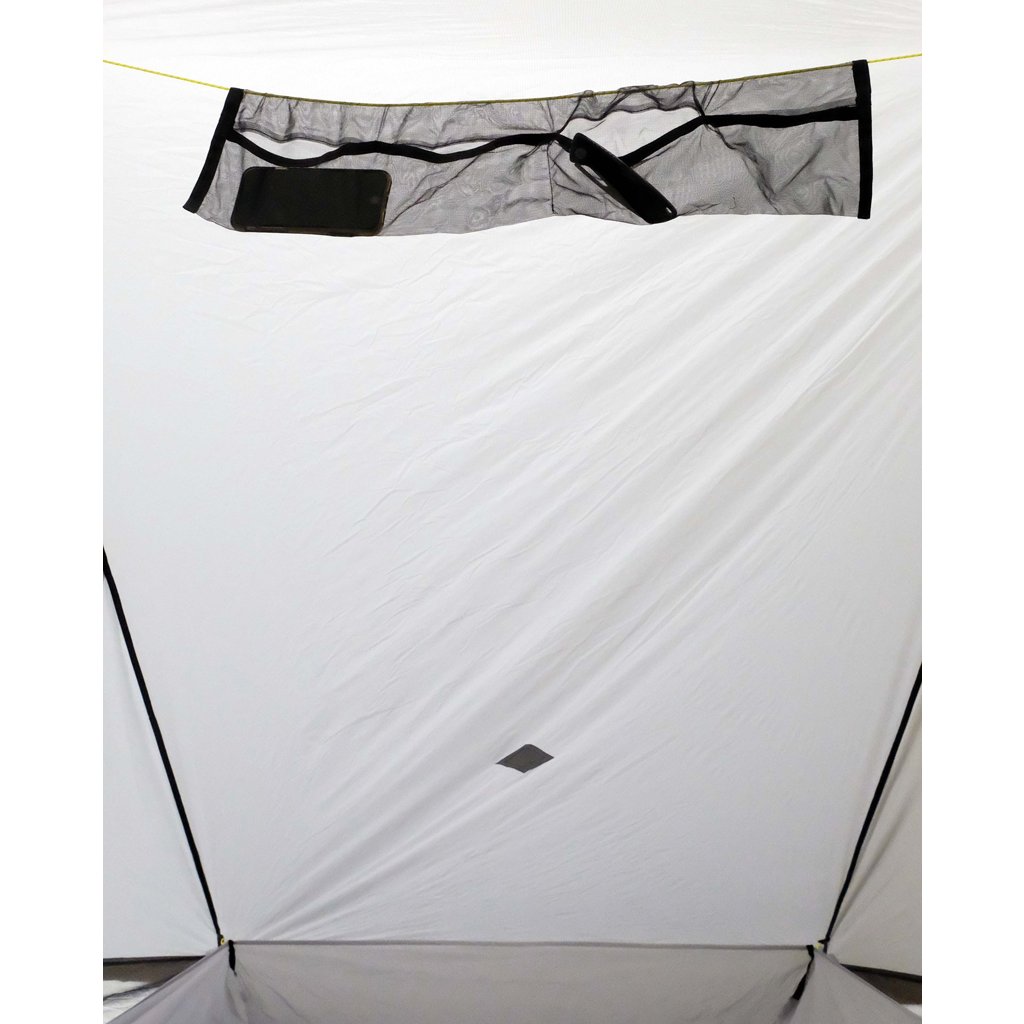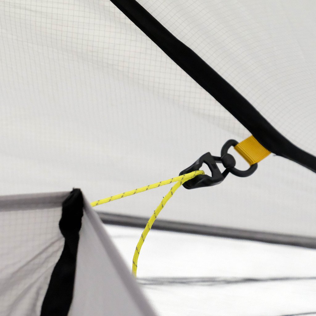 Oběma vrcholům samozřejmě nechybí 2 ventilační otvory pro minimalizaci kondenzace uvnitř tarpu. V plochách tarpu jsou na obou stranách ještě dodatečná poutka pro další vypnutí a zvětšení prostoru nad hlavou a nohama. Díky promyšlené konstrukci pyramidy a lehce vyoseným vrcholům je v tarpu dostatek místa, abyste se mohli bez problému posadit aniž byste se otírali hlavou o stěny tarpu.