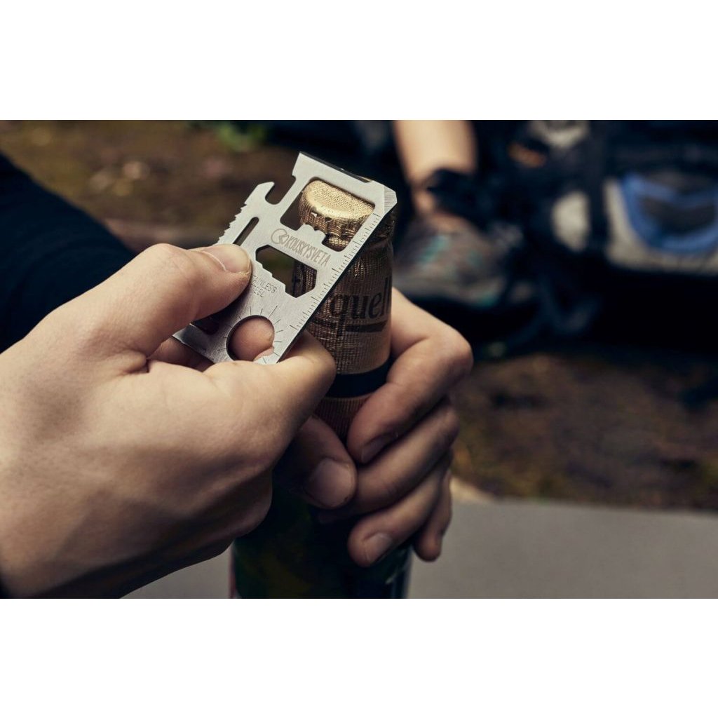- Multifunkční kovová karta - obsahuje otvírák na konzervy, nůž, šroubovák, pravítko, ovírák na lahve, klíč na ploché šroubky ve 4 velikostech, pilka, otvor pro zavěšení