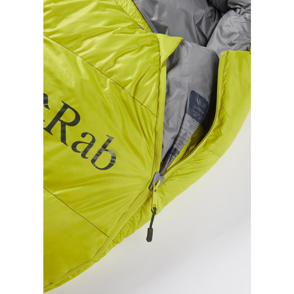 Řada spacáků Rab Alpine je určena pro horská dobrodružství jako je alpinismus, nebo vysokohorský trek. Díky vyrovnanému poměru váhy, tepla, sbalitelnosti a pohodlí ale skvěle poslouží jako lehký třísezónní spacák pro většinu outdoorových aktivit. Rab Alpine 800 je naplněn 800 gramy kachního prachového peří s plnivostí 650+FP. Peří má hydrofobní úpravu od Nikwaxu. Díky tomu lépe snáší vlhkost, rychleji schne a nabírá zpět plný loft. Veškeré peří používané Rabem samozřejmě splňuje certifikaci původu peří R.D.S. Vnější materiál je osvědčený Pertex Quantum, který vyniká svojí prodyšností a je větruodolný. Vnitřní podšívka je z 20D recyklovaného nylonu (38g/m²). Rab především myslel na technické detaily. Tvar spacáku je ve tvaru šipky aby snížil zbytečný objem a váhu. Zároveň zamezuje migraci peří a udržuje jej rovnoměrně rozprostřené po celém těle. Lichoběžníková konstrukce komor "boxwall" s diferenciálním řezem eliminuje vznik studených míst a maximalizuje loft peří. Rabu se povedla technicky promyšlená kapuce a vnitřní ramenní límec, který navazuje na izolovanou přepážku podél zipu zabraňující úniku tepla. Vše se dá samozřejmě pohodlně stáhnout. Nechybí vnitřní kapsička na zip pro úschovu čelovky, telefonu apod.