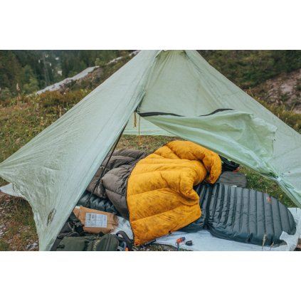 Revelation se dá dole úplně rozepínat a je to tudíž fajn volba spíš do tepla, kdy oceníte volnou přikrývku. I proto jsme zvolili variantu s limitem 50 °F (10 °C) a teplejší variantu 30 °F(-1 °C) a 40 °F (5 °C). Sbalíte ho pohodlně do 4 nebo 8 litrového dry sacku a jeho hmotnost 355 g (50 °F) v batohu nebo bikepackingových brašnách vůbec nezaznamenáte! To že vyrážíte ultralight ještě neznamená, že se musíte vzdát svého komfortu! Enigma má dole klasický uzavřený "footbox" jako spacáky. Ten určitě podrží víc tepla, než gumkou stažený konec u Revelationu. Z podstaty věci je to vhodnější řešení do nižších teplot a proto jsme ho do nabídky zařadili ve verzi s limitem 20 °F (-6 °C) a také 30 °F(-1 °C). Do ještě nižších teplot už nám dává větší smysl spacák s kapucí. Enigma je o chlup lehčí a sbalitelnější než Revelation, protože nemá v nohách zip ani stahování.