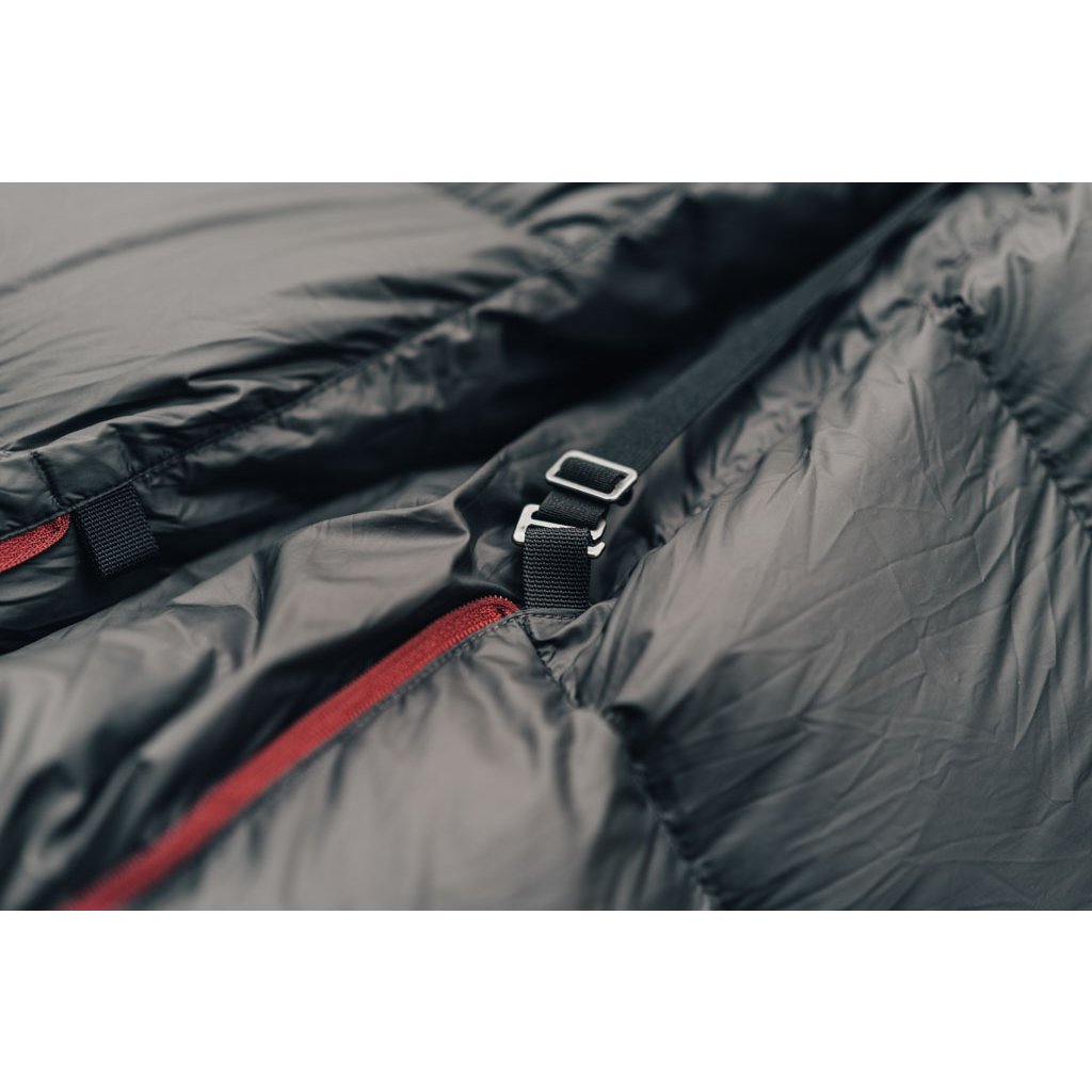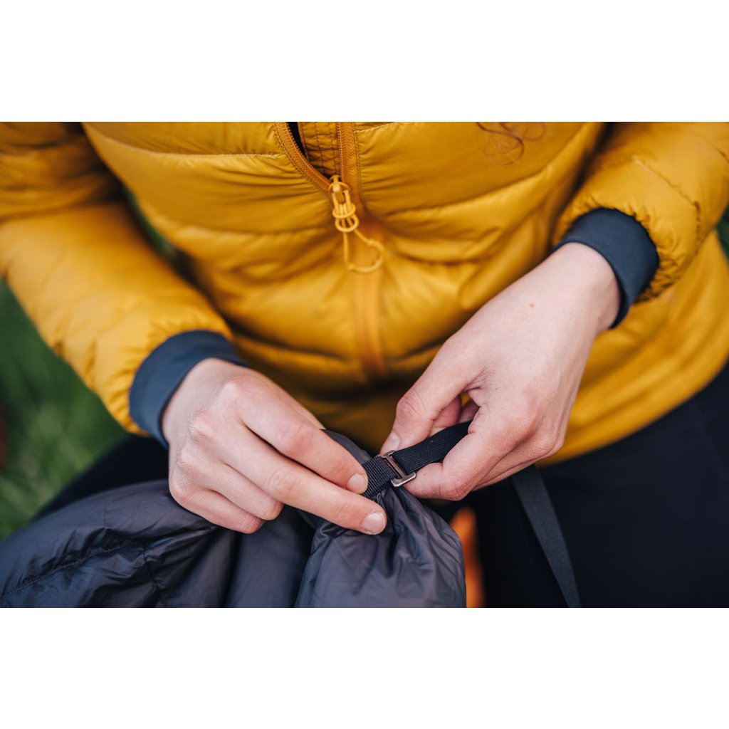Ke karimatce se Multi Quilt 250 připevňuje pomocí nastavitelných popruhů a minimalistických kovových háčků, které pod sebou neucítíte. Oba konce quiltu se dají stáhnout pomocí pružných šňůrek, které zároveň poslouží i pro uchycení pod hamaku. K sepnutí horního okraje kolem ramen slouží malý druk. Velmi povedený je izolační límec kolem okraje quiltu, který účinně zamezuje tepelným ztrátám.