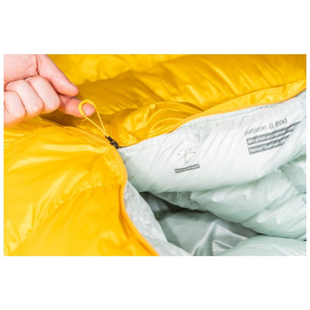 Poloautomatický zip SHZ se dvěma jezdci končící u kotníků má hrubost 3 mm místo klasických 6 mm, a to kvůli snížení úniku tepla a nižší celkové hmotnosti. Poloautomatický zip na spacáku je taková Patizoní specialitka a za nás funguje výborně.