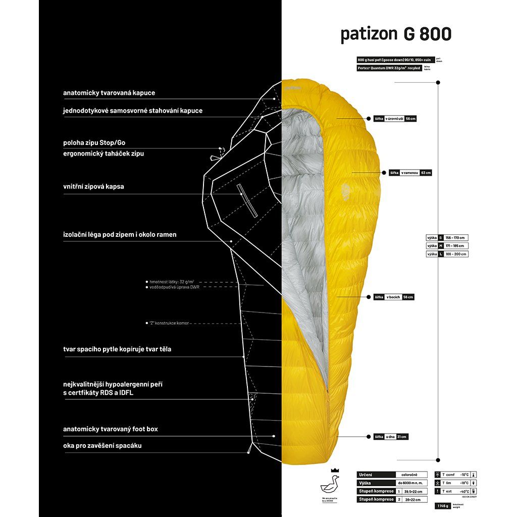 Patizon u svých spacáků udává hned tři hodnoty tepelného komfortu (komfort, limit, extrém) měřené dle normy ISO EN 23537. Konkrétně u modelu G 800 je hodnota komfortu -10 °C, limitu -18 °C a extrému -40 °C. Tyto hodnoty z něj tak dělají plnohodnotný čtyřsezónní spacák a ideální volbu na pohodlné spaní venku s teplotami pod nulou. Uvedené hodnoty je ale samozřejmě potřeba brát s určitou rezervou, protože je mnoho faktorů, které výsledný komfort ovlivňují (tělesná kondice, výběr vhodného místa, vlhkost vzduchu, únava atd.) V nabídce máme i výrazně lehčí, třísezónní verzi Patizon G400.