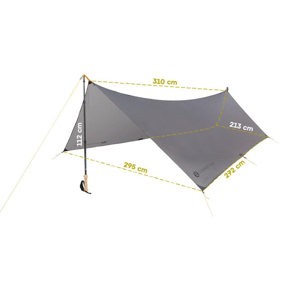 I přesto, že se jedná o jeden z nejlehčích tarpů pro 2 osoby na trhu, tak není ošizený na svých rozměrech. Právě naopak. Délka hřbetu je fantastických 310 cm, délky stěny u země má 272 cm. V přední části má tarp skvělou šířku 294 cm a u nohou 213 cm. Tyto rozměry tak poskytnou naprosto dostatečný prostor pro dvě osoby i s bagáží. Celková hmotnost přístřešku včetně vypínacích šňůr je neuvěřitelných 275 gramů (s obalem – 6 gramů navíc). Po sbalení má tarp legračních 21 x 12 cm, takže o něm v batohu nebudete ani vědět. Tento tarp můžeme rozhodně doporučit pro vícedenní treky v mírnějších podmínkách.