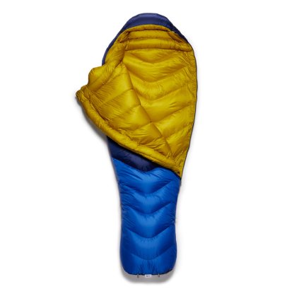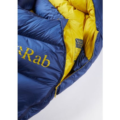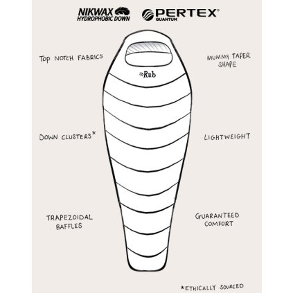 Výrobce si na nových modelech dal skutečně hodně záležet. Vylepšil tkaninu i design pro vytvoření teplejších, ale lehčích spacích pytlů. Krom toho přišel s inovativním designem komor, který umožňuje efektivnější využití vlastností peří a zabraňuje přesunu peří v komorách a vzniku studených míst. Neutrino má svrchní materiál 100% recyklovaný Pertex Quantum s DWR vodě odpudivou úpravou, ten má nižší gramáž než Pertex Quantum Pro a je o něco prodyšnější a měkčí. Spacák bude díky své nízké hmotnosti velmi vhodný pro vícedenní trekking a díky náplni v podobě 800 gramů peří obstojí i v zimních podmínkách. Kvalitní DWR úprava si bez problému poradí s ranní rosou a spaním pod širákem. Spacák je naplněn 800 gramy špičkového, husího peří s plnivostí 800FP. Peří má hydrofobní úpravu od Nikwaxu. Díky tomu lépe snáší vlhkost, rychleji schne a nabírá zpět plný loft. Veškeré peří používané Rabem samozřejmě splňuje certifikaci původu peří R.D.S. Rab především myslel na design a technické detaily spacáku. I přes svoji nízkou hmotnost je spacák velmi prostorný. Rabu se především povedla technicky promyšlená kapuce a perfektní, tvarovaný vnitřní límec. Vše se dá samozřejmě pohodlně stáhnout. Nechybí vnitřní kapsička na zip pro úschovu čelovky, telefonu apod. Skvělý je především "foot box", který je ve tvaru jakési ploutve, díky tomu máte mnoho prostoru pro nohy. Lichoběžníková konstrukce komor eliminuje vznik studených míst. Dvoucestný YKK zip v 3/4 délce je dostatečný a nebude určitě dělat zásadní problémy.