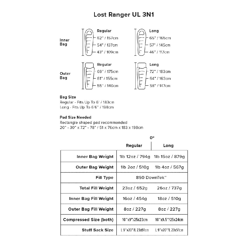 Regular : použitelný pro postavy do 183 cm, rozměry po sbalení 23 x 51 cm, kompletní hmotnost náplně 538 g, Long : použitelný pro postavy do 198 cm, rozměry po sbalení 23 x 51 cm, kompletní hmotnost náplně 595 g.