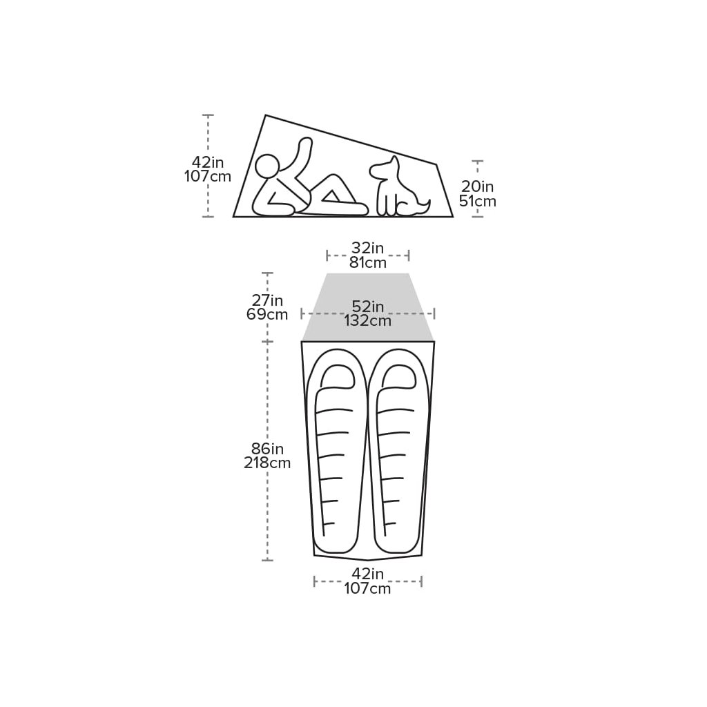 Řada Fly Creek je designovaná s ohledem na co nejnižší hmotnost – jeden vchod zepředu, menší předsíňka, žádný extra prostor navíc. Je to tak akorát na pohodlné přespání a základní fungování. Pro přespání 2 osob je to v pořádku, ale pro větší fungování uvnitř spíše doporučujeme řadu Copper Spur. Ale stále je v uvedených 1190 g hmotnosti dvouplášťová, samonosná konstrukce, dostatek prostoru pro 2 karimatky, hromada kvalitních kolíků, vypínací šňůry i s linelocky a obaly. Kompletní balíček v nepromokavém, kompresním obalu. Ale nebojte se, není to jen malá rakvička – na délku se dovnitř vejdete i se 190cm a to kolem hlavy a ramenou zbyde ještě docela dost prostoru. Když se já se svými 182cm uvnitř posadím, nad hlavou mi zbývá víc než 10cm. Do předsíně uložíte na šířku i dost velký batoh. Rozhodně menší batoh je lepší, nebude překážet při cestách ven ze stanu.