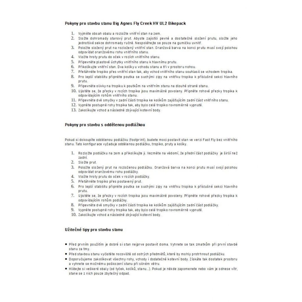 V místě uchycení prutu k podlážce jednoduše přicvaknete tropiko plastovou přezkou k popruhu na podlážce. Další vypínací body buď navlíknete na kolíky od podlážky, nebo přes šňůru a linelock vypnete a zakolíkujete zvlášť. S rychlým nahlédnutím do návodu to jde i na poprvé hladce a rychle. Všechno je jednoduché a promyšlené. Na mnoha detailech stanu je vidět, že u Big Agnes vědí co dělají – ať už je to použití linelocků, tak třeba boky vnitřního stanu kolem těla a hlavy z textilie místo síťoviny (přijde vhod v silném větru, aby dovnitř nelítal prach, nebo když se v noci moc vrtíte a dotýkali byste se až oroseného tropika, tak se nenamočíte, atd.), několik kapsiček na bocích i ve vrcholu na mobil, čelovku atd. , a hlavně výborné zpracování.