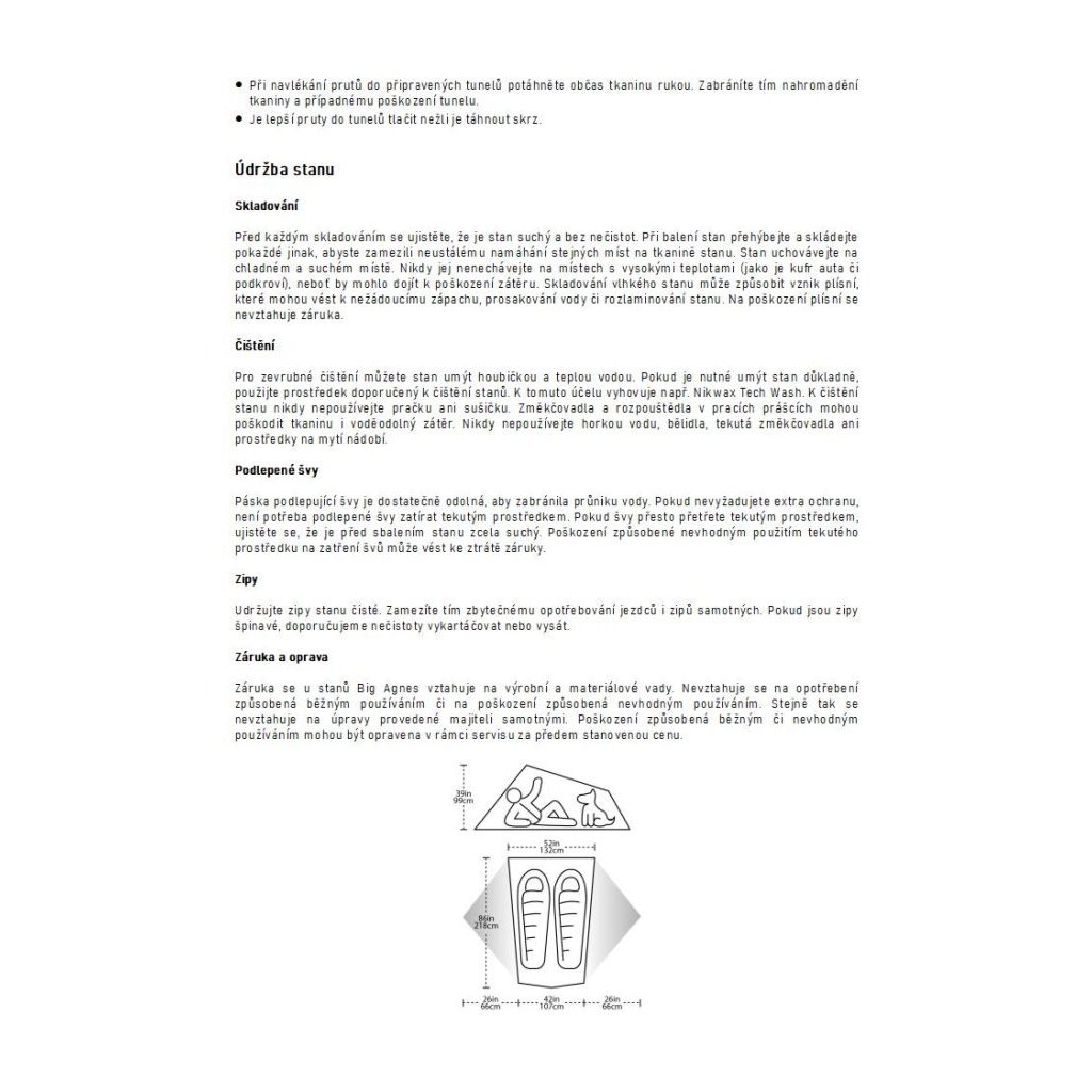 Další vypínací body buď navlíknete na kolíky od podlážky, nebo přes šňůru a linelock vypnete a zakolíkujete zvlášť. S rychlým nahlédnutím do návodu to jde i na poprvé hladce a rychle. Všechno je jednoduché a promyšlené. Na mnoha detailech stanu je vidět, že u Big Agnes vědí co dělají – ať už je to použití linelocků, tak třeba nacvakávání moskytiéry na příčný prut a jeho navlíkání do kapsiček v tropiku. Vhod přijde několik kapes na bocích, jedna u hlavy na mobil, čelovku atd. , a hlavně výborné zpracování. Při použití originálního footprintu a stavby bez vnitřního stanu se pak dostanete na vynikající váhu 765g!