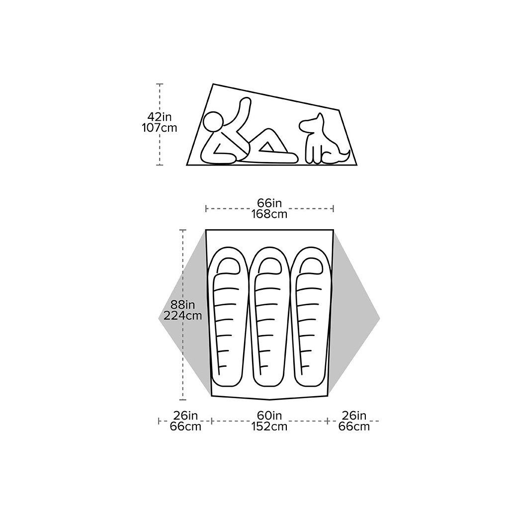 Díky krátkému příčnému prutu uprostřed stanu, jsou boční stěny vnitřního stanu téměř svislé a je tam dost prostoru pro fungování tří lidí. Když chcete spát „pod širákem“, můžete postavit vnitřní stan samostatně. Na druhou stranu, pokud chcete očesat hmotnost na minimum, tak s použitím originálního „footprintu“ můžete postavit samostatně jen tropiko, vnitřní stan nechat doma a de facto si vyzkoušet, jaké to je používat tarp. V uvedené hmotnosti je opět dvouplášťová, samonosná konstrukce, dostatek prostoru pro tři karimatky vedle sebe, 9 kvalitních kolíků, vypínací šňůry i s linelocky a obaly. Kompletní balíček.